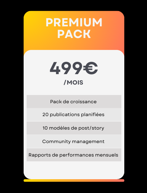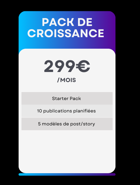 Idéal pour les indépendants, le pack de croissance vise à créer du contenu ciblé tout en développant votre image de marque. Démarquez vous de vos concurrents et boostez votre visibilité en ligne.